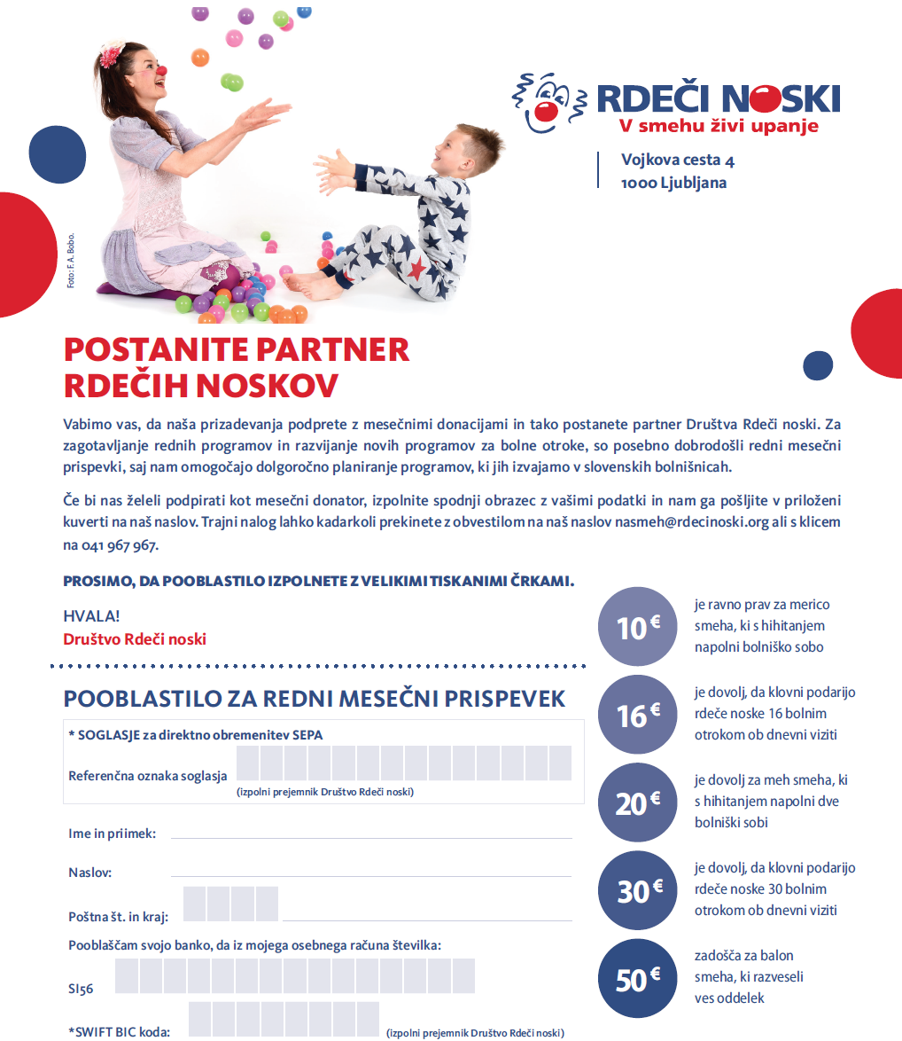 Če bi nas želeli podpirati kot mesečni donator, izpolnite spodnji obrazec z vašimi podatki in nam ga pošljite na naš naslov: Društvo Rdeči noski, Vojkova cesta 4, 1000 Ljubljana.